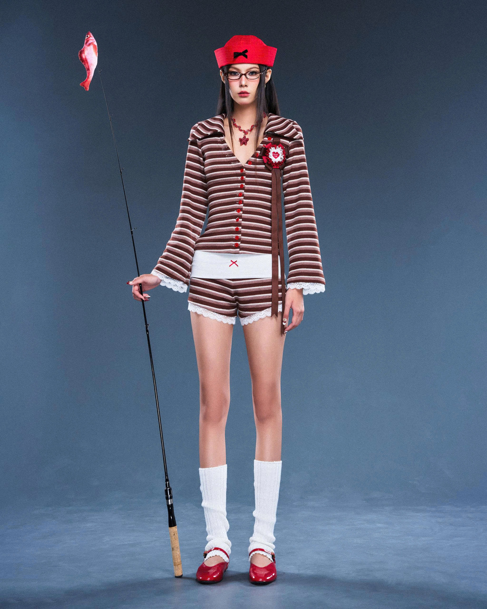 Áo cổ sơ mi tay dài sọc nâu nút đỏ phối ren - Alibi Top