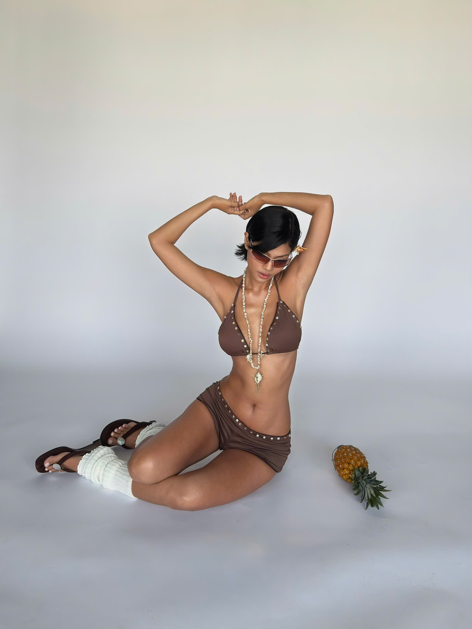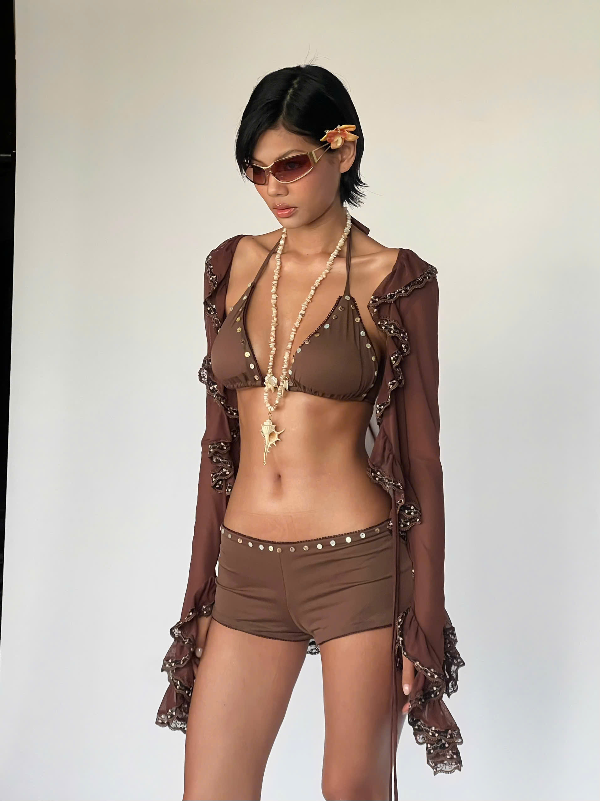 Quần shorts ngắn nâu ôm đính nút - Button Shorts