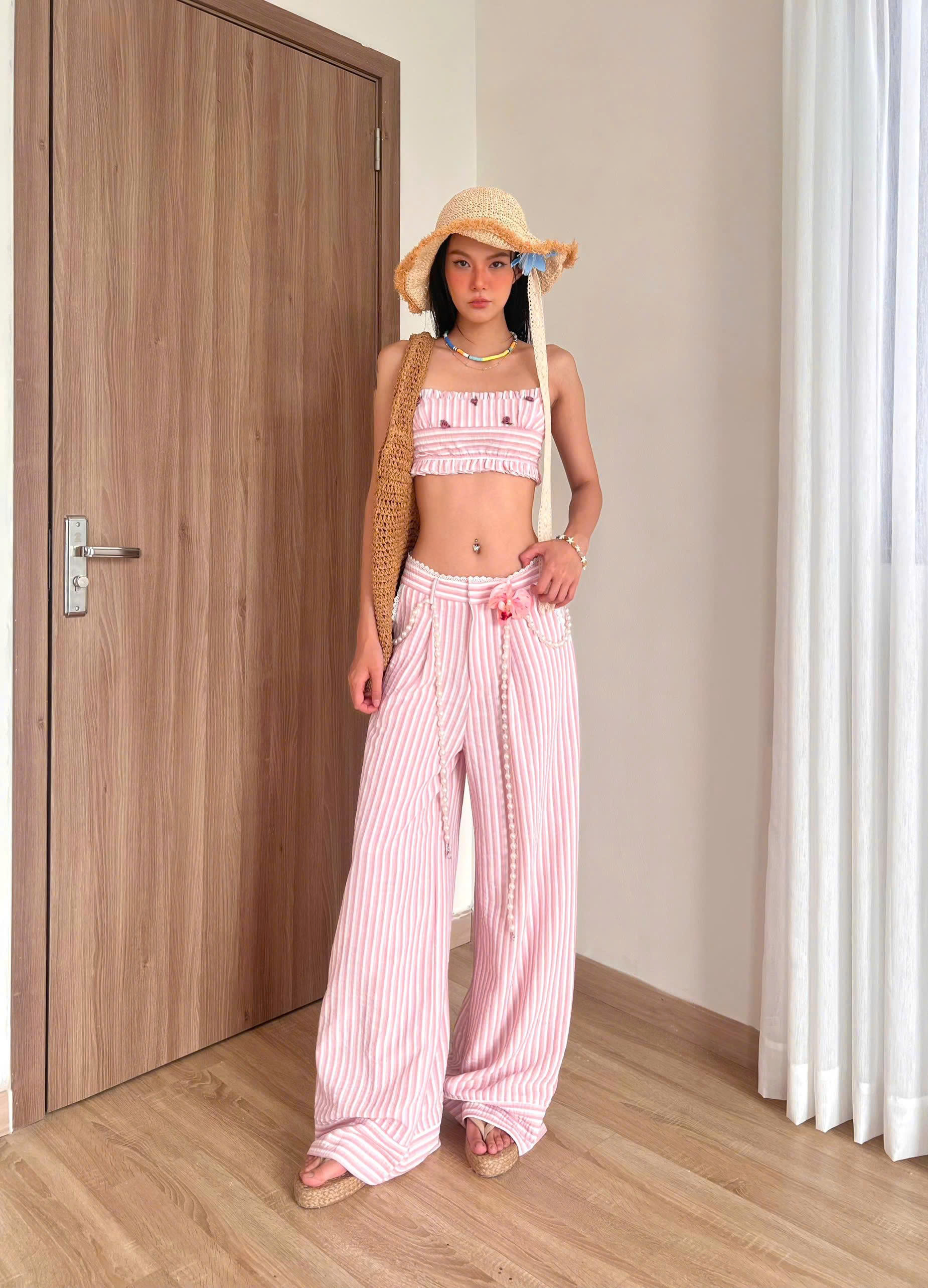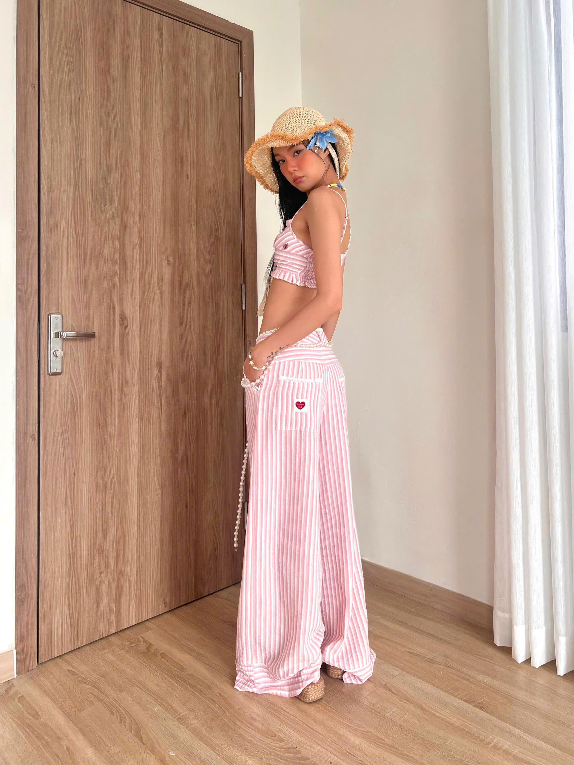 Áo croptop hai dây sọc hồng phối hoa nhí nổi - Clover Croptop
