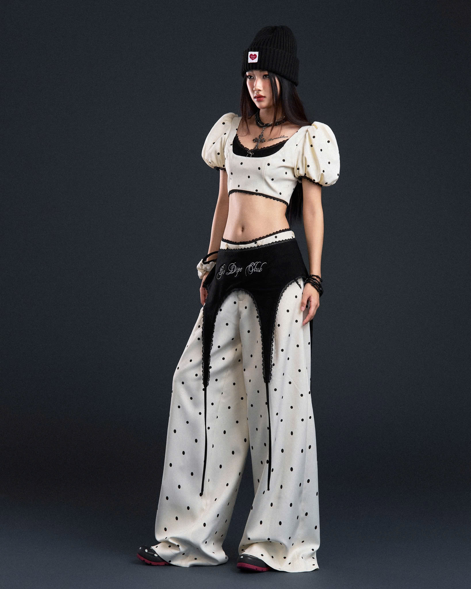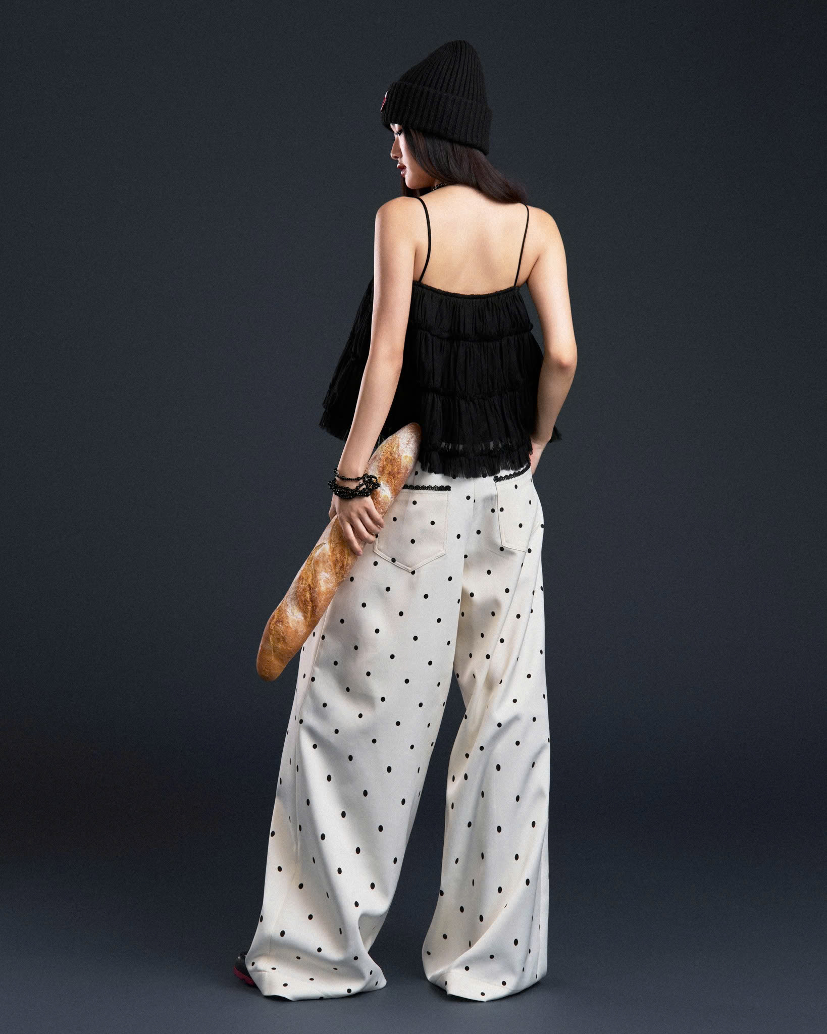 Quần dài ống rộng kaki màu kem họa tiết chấm bi đen