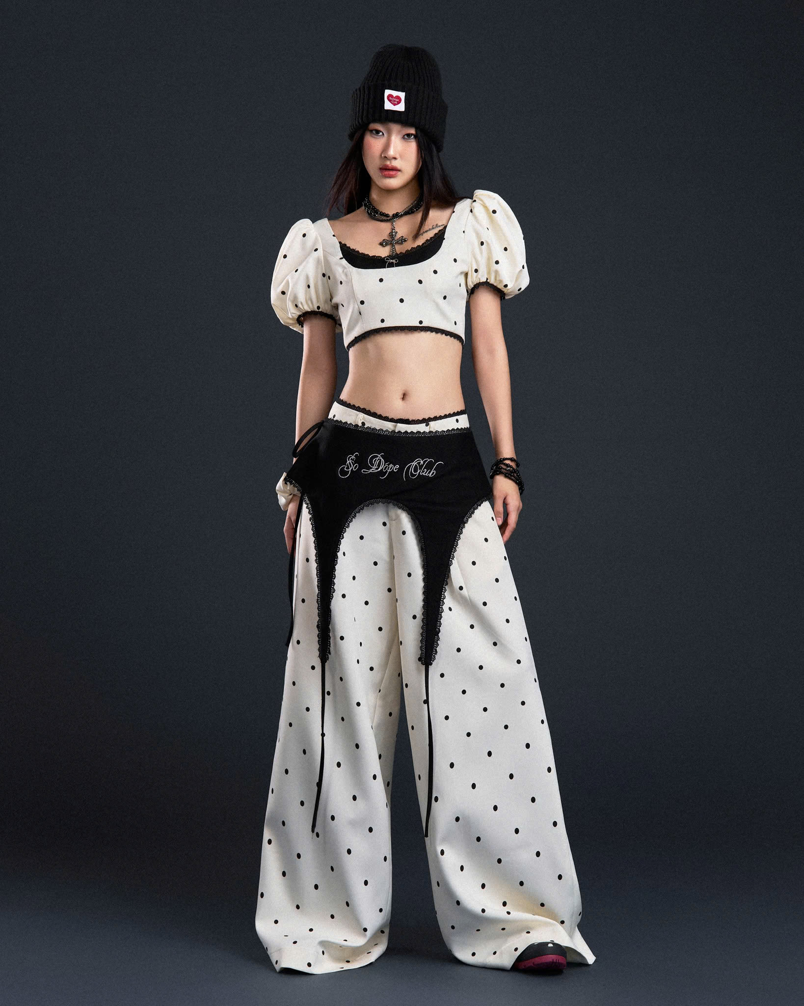 Áo croptop cổ sơ mi chấm bi tay búp sen, có phần thun smocking co dãn phía sau