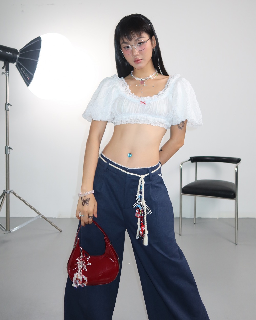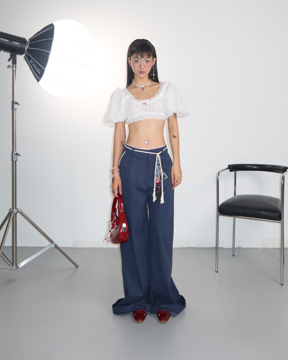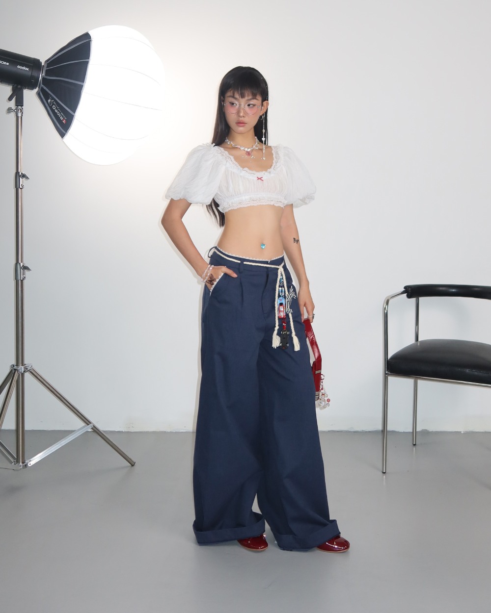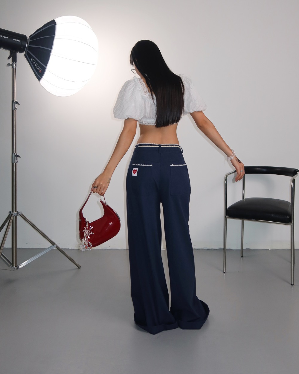 Quần dài ống rộng xanh navy phối ren - Humid Pants