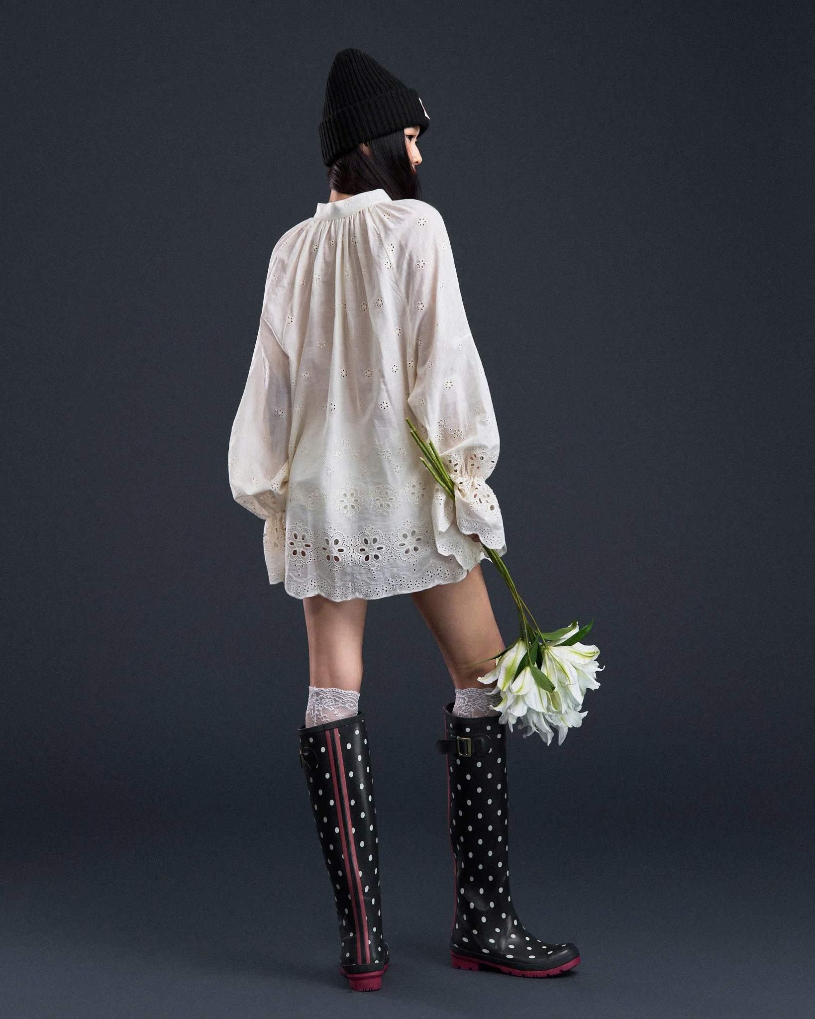 Đầm form rộng vải tho họa tiết hoa nổi, tay dài phồng có dây rút