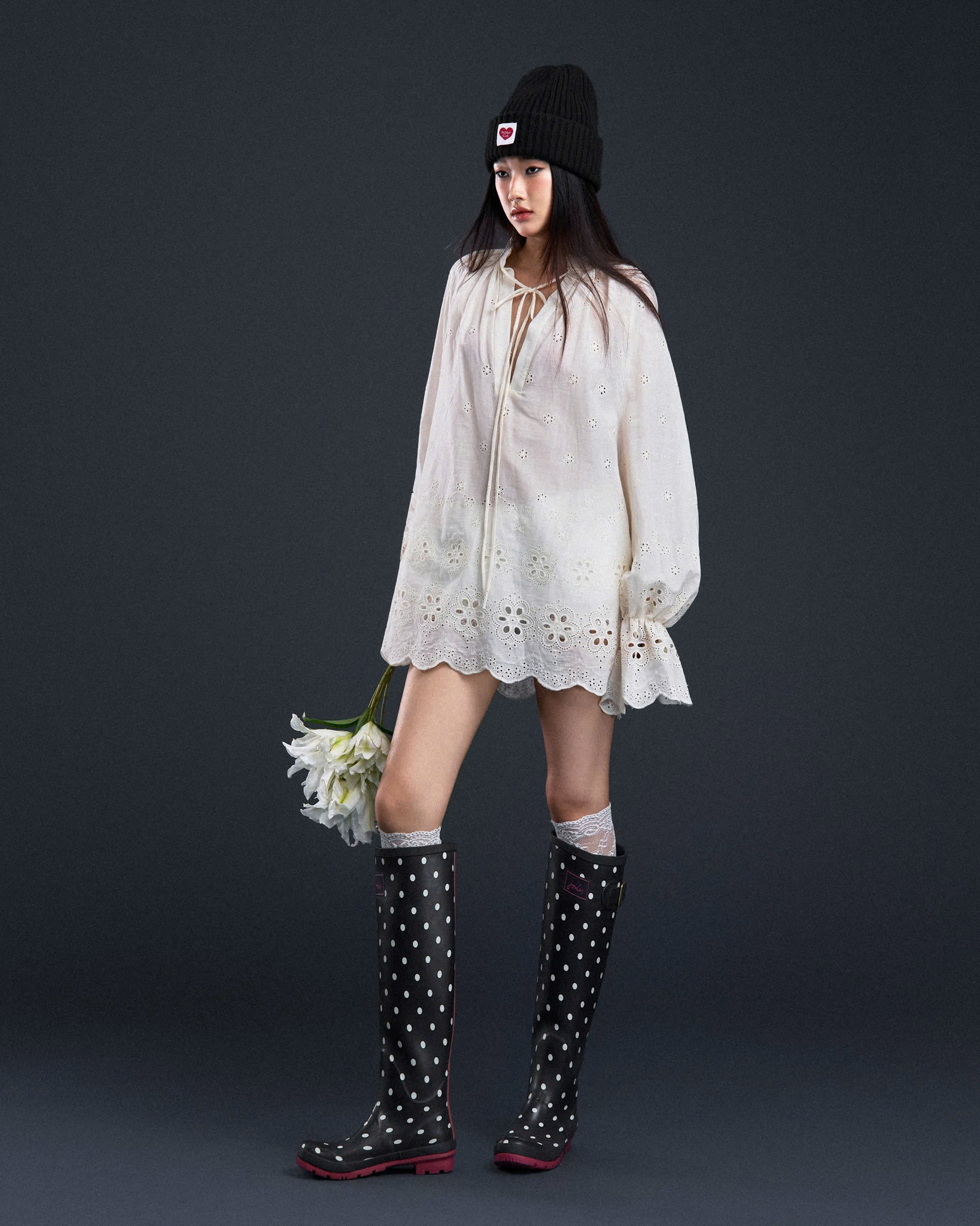Đầm ngắn ren kem phồng tay dài cổ V - Peom Dress