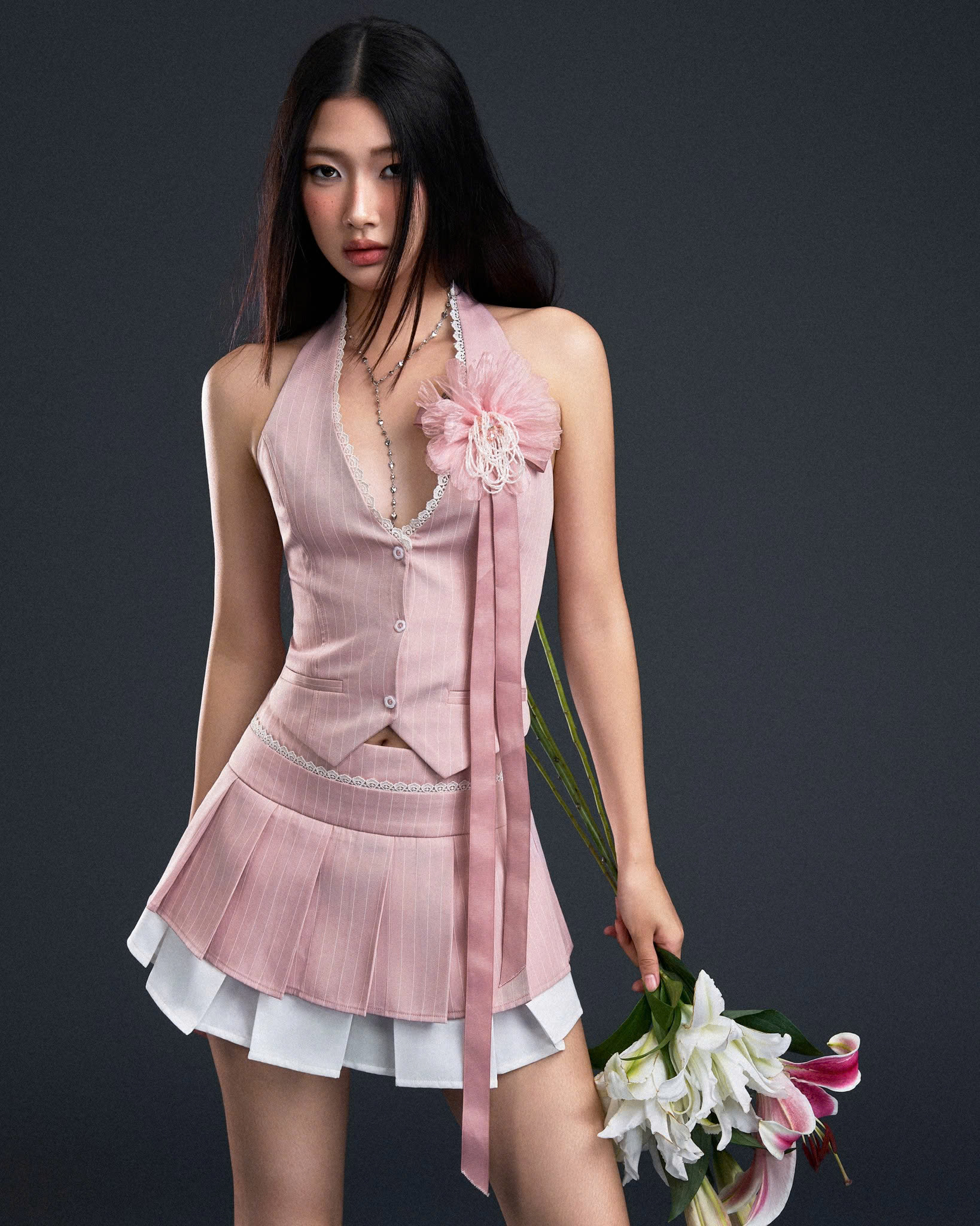 Chân váy ngắn chữ A hai tầng dáng váy tennis sọc hồng ruốc phối trắng