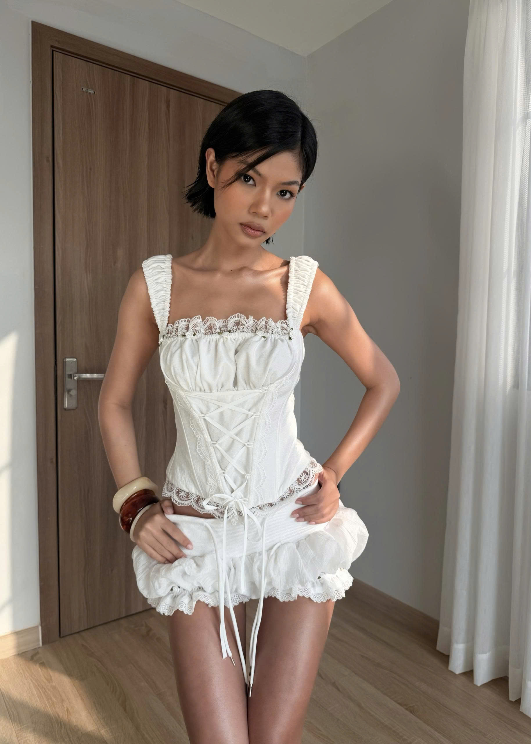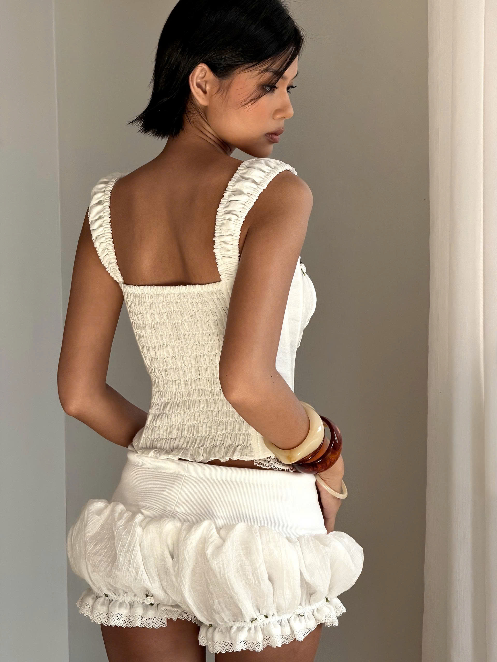 Áo trắng hai dây form corset siết eo phối ren - Shimmer Top