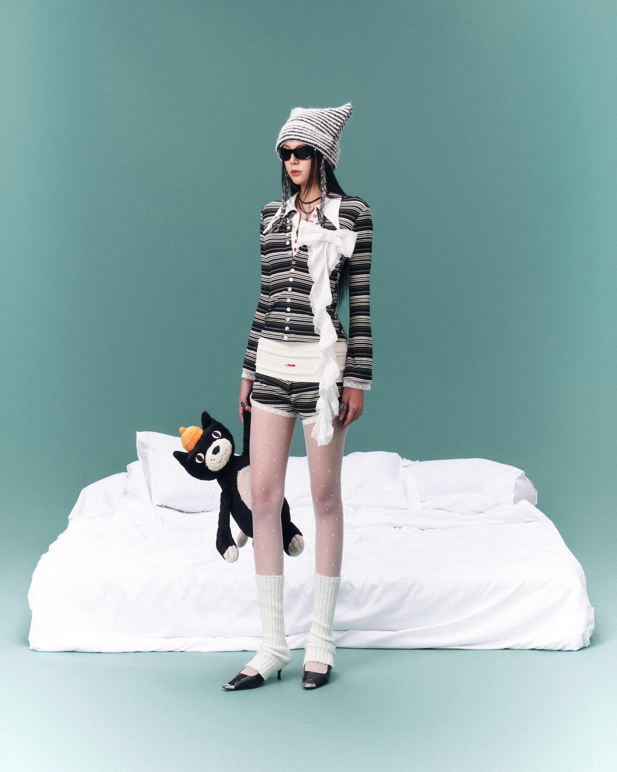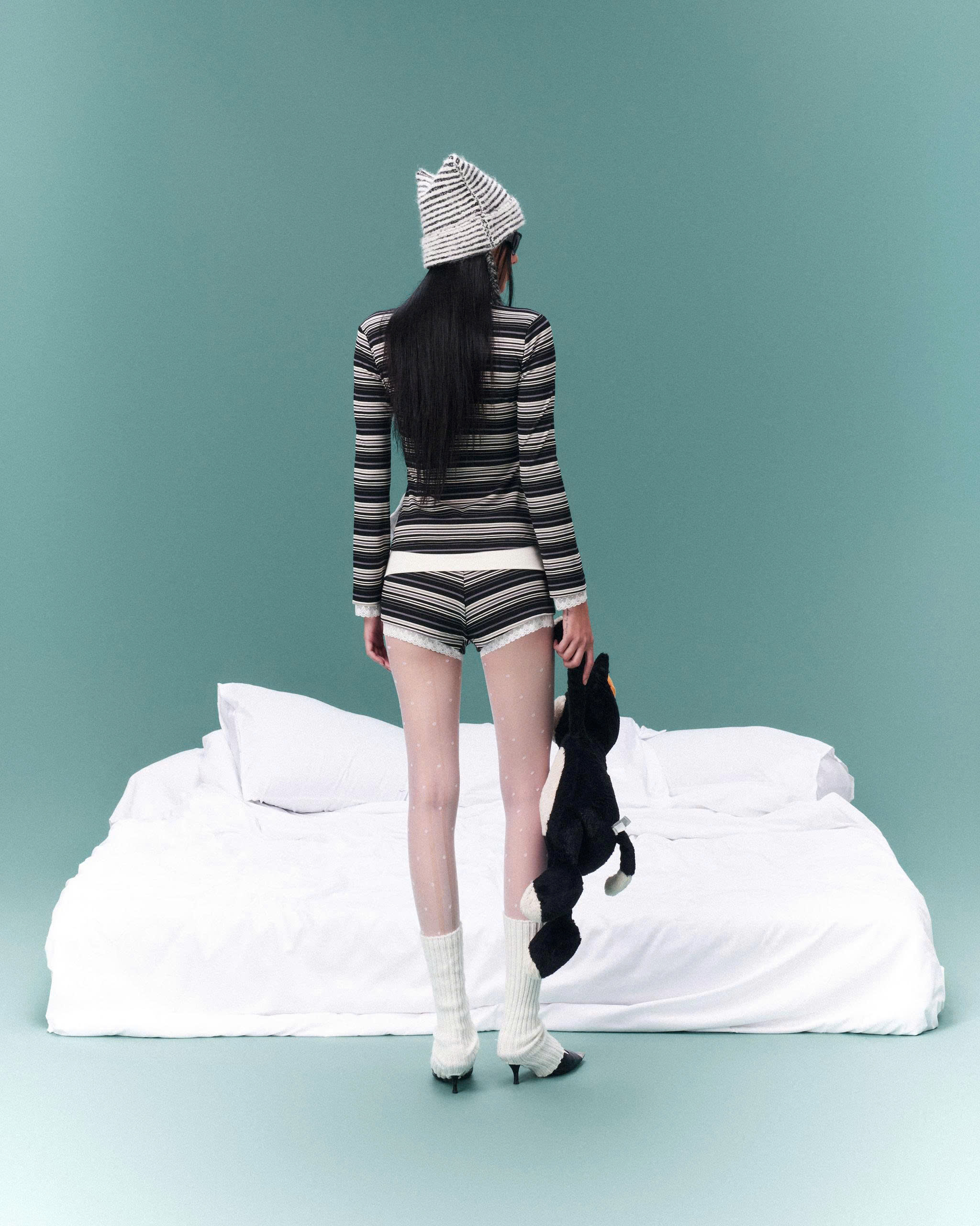 Quần ngắn sọc xám đen vthun len dệt phối ren - Chucky Lavender Shorts