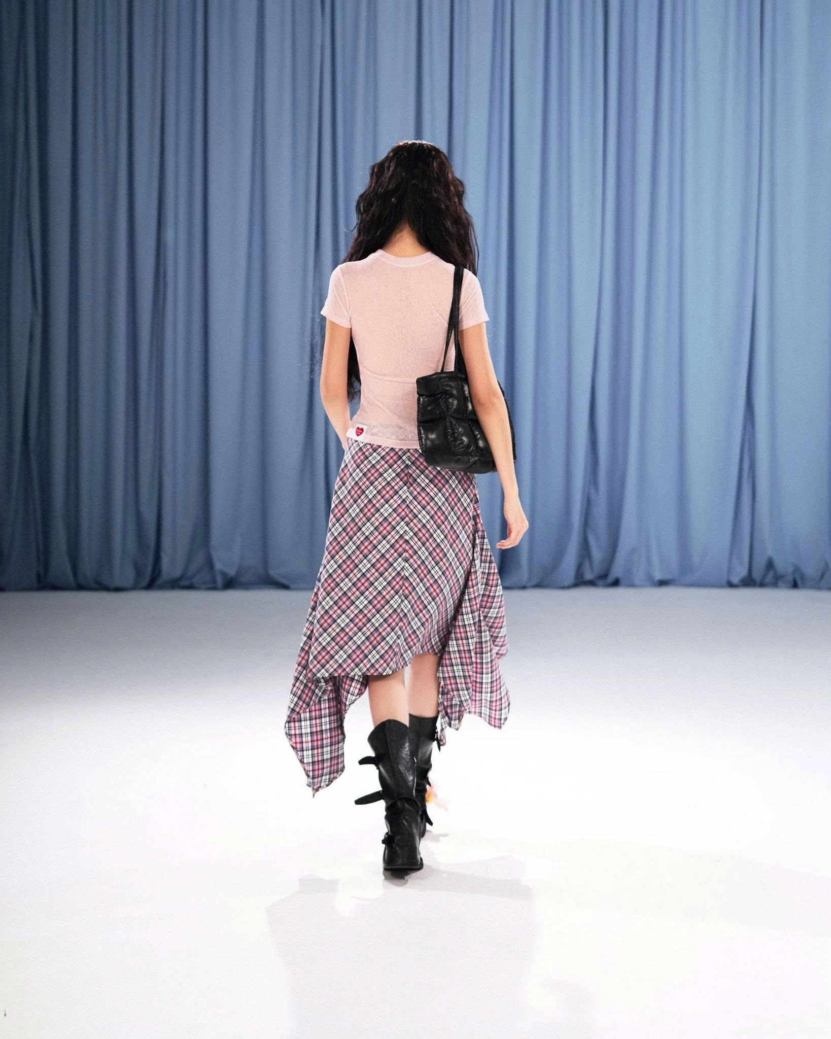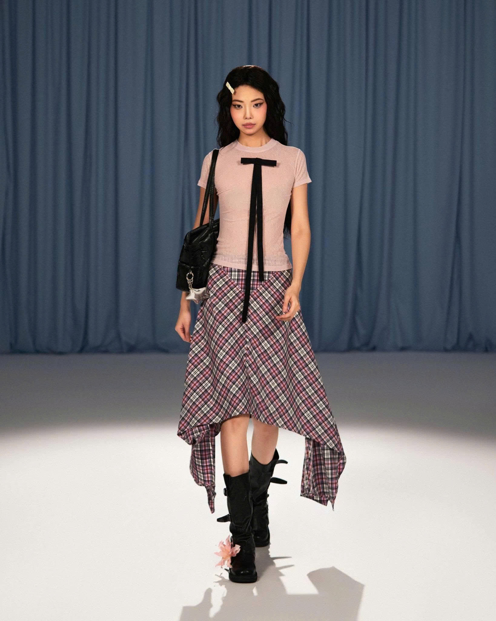 Áo thun giấy màu hồng ruốc kèm charm nơ